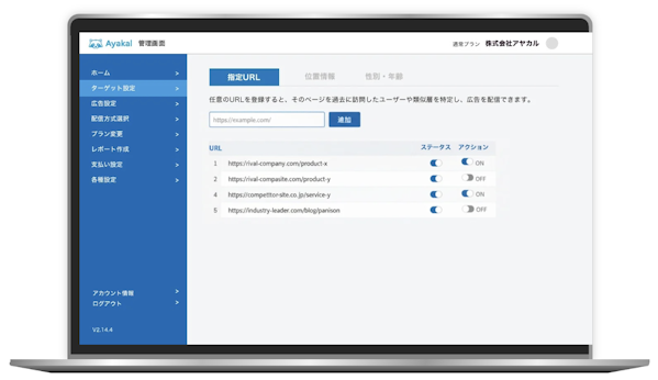 しかし、Ayakalでは実際に訪問された競合他社のURLを広告配信の起点として直接指定することができます。