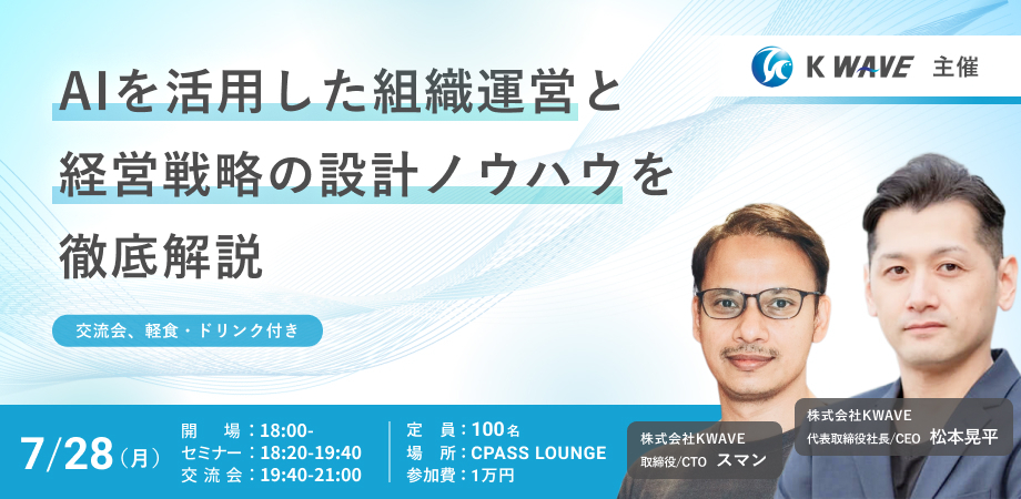 株式会社KWAVEは、2025年7月28日(月)18時より、CPAエクセレントパートナーズ株式会社内「CPASS LOUNGE」にて、AIをテーマとした勉強会兼交流会を開催いたします。