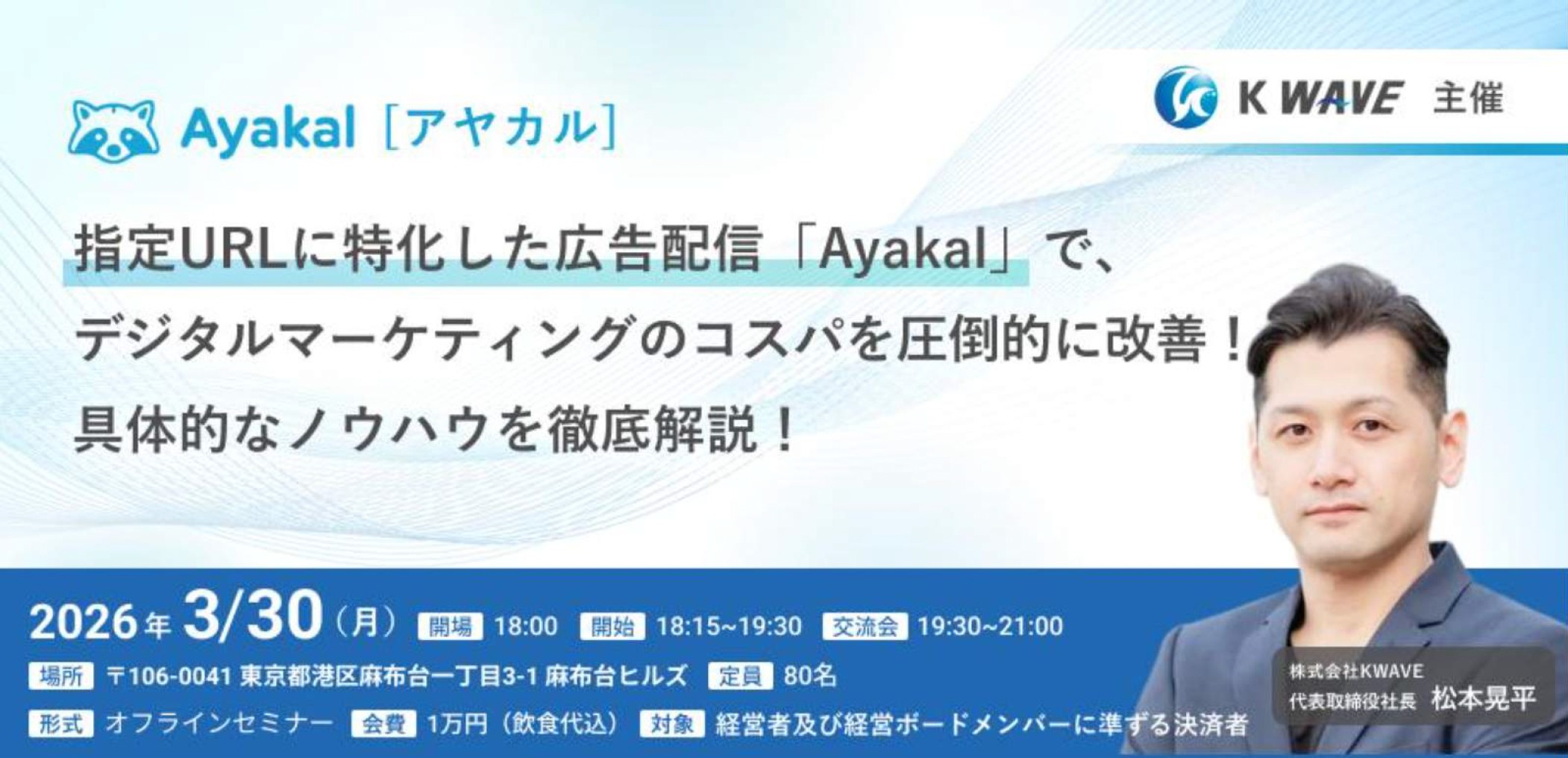 2026年3月30日(月)、株式会社KWAVEは、『指定URLに特化した広告配信「Ayakal」で、デジタルマーケティングのコスパを圧倒的に改善!具体的なノウハウを徹底解説!』をテーマにしたセミナー&交流会を、クラウドワークス本社(麻布台ヒルズ森JPタワー28F)にて開催しました。