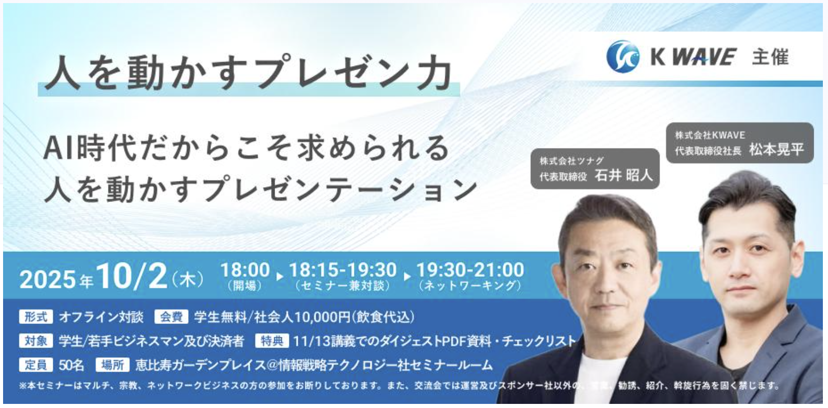 本イベントでは、元ローソン執行役員で現・株式会社ツナグ代表取締役の石井昭人氏と、株式会社KWAVE代表取締役社長 松本晃平氏が登壇し、“伝える”を超えて“人を動かす”ためのプレゼンテーションの要諦を、現場改革や事業成長を牽引してきた実例とともに講演が行われました。
